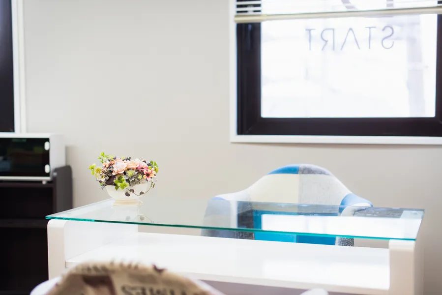 オシャレなオープンスペースのネイルコーナー。コンセントあり。窓のブラインドあり。