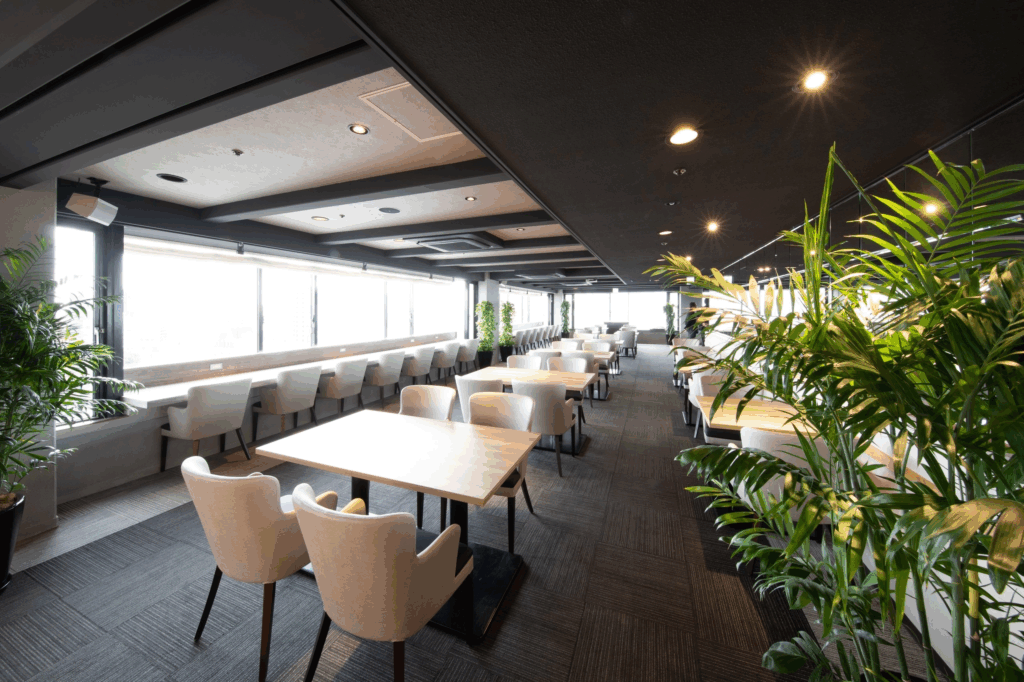 プラトンホテル四日市10Fから見える景色は、伊勢湾や諏訪公園などを望む心地の良さ。開放感のある空間と植物の癒し、素材の温もりを感じる環境がゆったりと過ごせる。様々な背景を持つユーザーが集まるワークスペース。